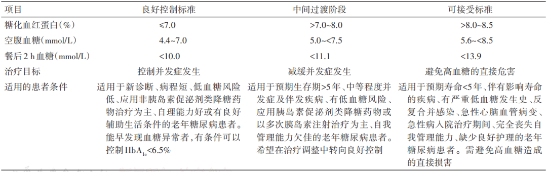 中间过渡标准(HbA1c 7.0%~8.0%):适用于预期生存期大于5年、有低血糖风险或自我管理能力欠佳的患者。